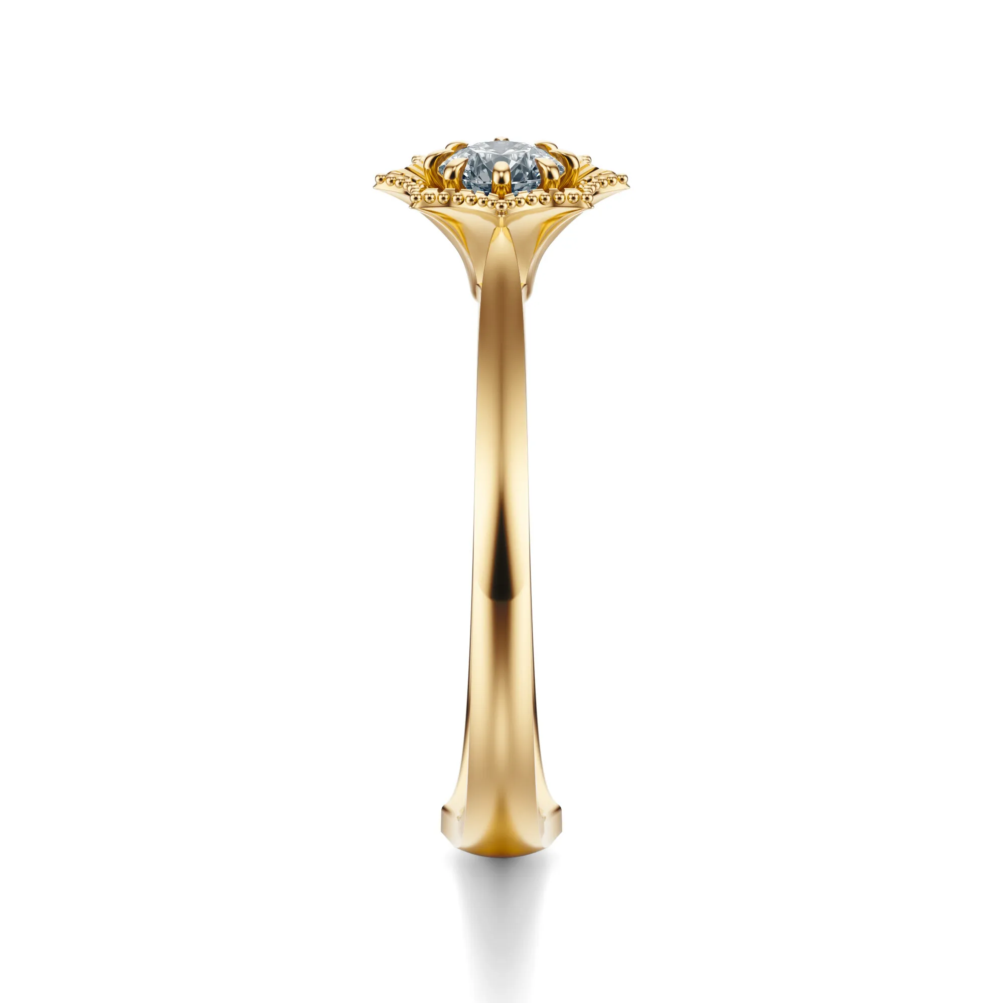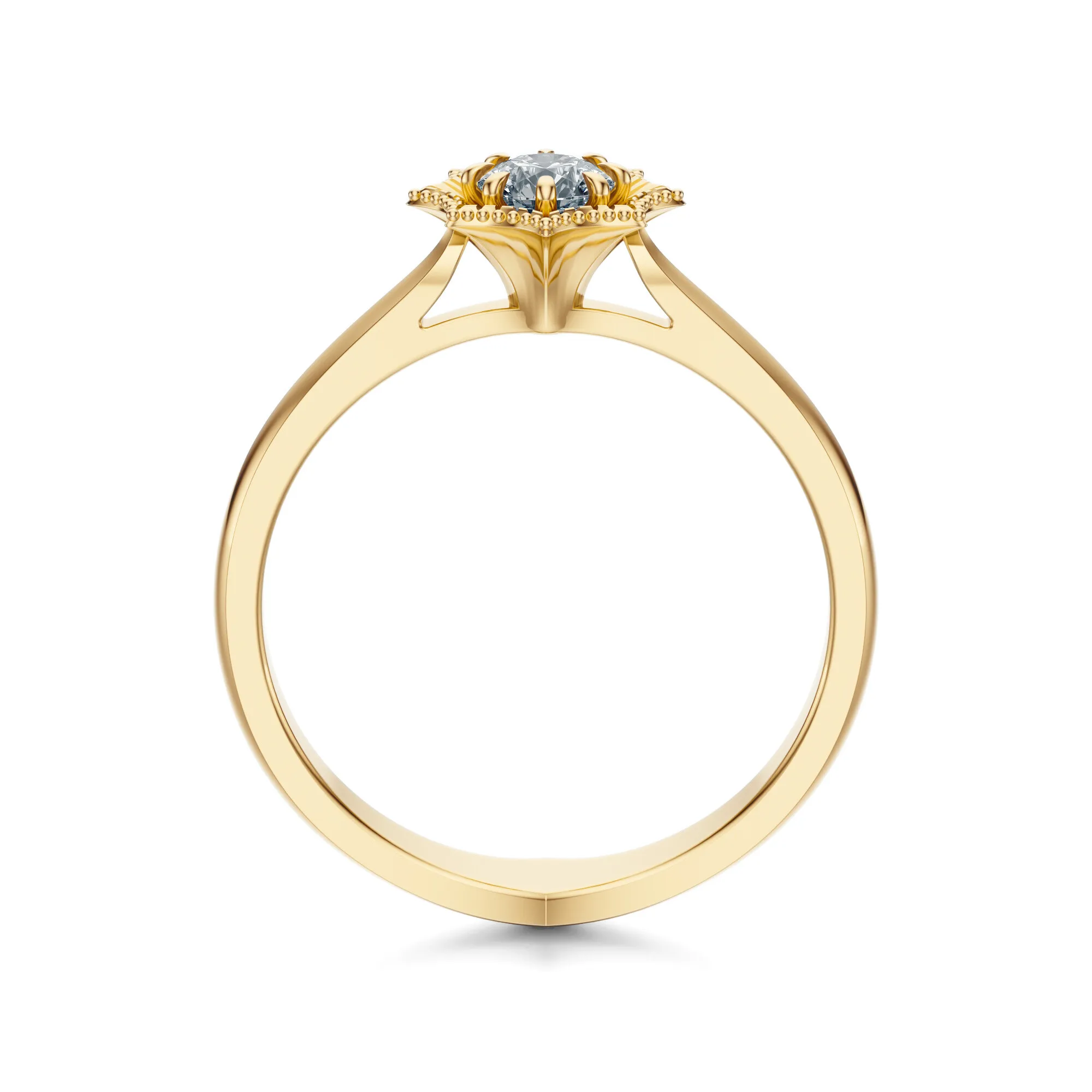 Złoty pierścionek z diamentem ukazuje pełnię blasku dzięki oprawie w formie stylizowanego kwiatu – motywu, który symbolizuje piękno, rozwój i wieczną miłość. Kompozycja ta nadaje całości delikatnie vintage’owy charakter, jednocześnie zachowując nowoczesną lekkość i precyzję wykonania. To idealny wybór dla kobiet romantycznych, z duszą artystki, które szukają biżuterii z duszą i przesłaniem.
